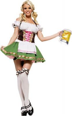 - Includes: German dirndl style peasant top dress w/ satin ribbon trim and stockings w/ matching bows.- Makes a perfect Halloween costume for your next Halloween party.
